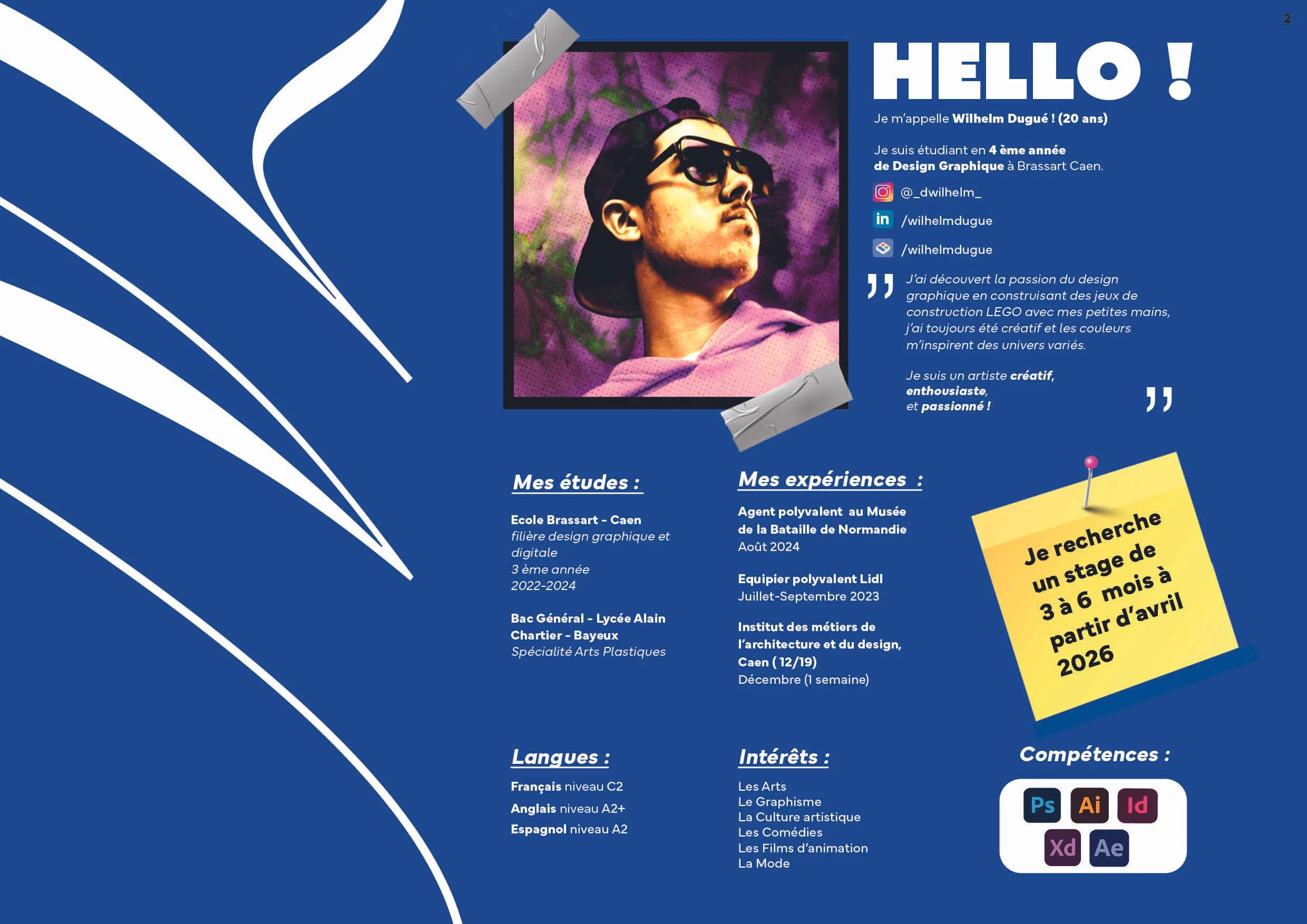 Wilhelm Dugué propose des services de design graphique créatifs et sur mesure : logos, affiches, flyers, identités visuelles, cartes de visite et motion design. Avec une approche artistique sensible et contemporaine, il conçoit des visuels qui racontent une histoire et reflètent l’identité de chaque projet. Son travail allie rigueur technique, sens esthétique et narration visuelle pour offrir des créations percutantes, uniques et adaptées aux besoins des clients.